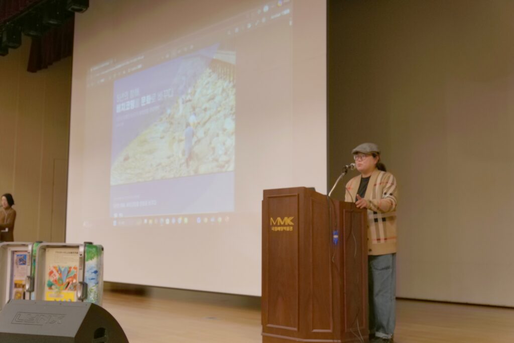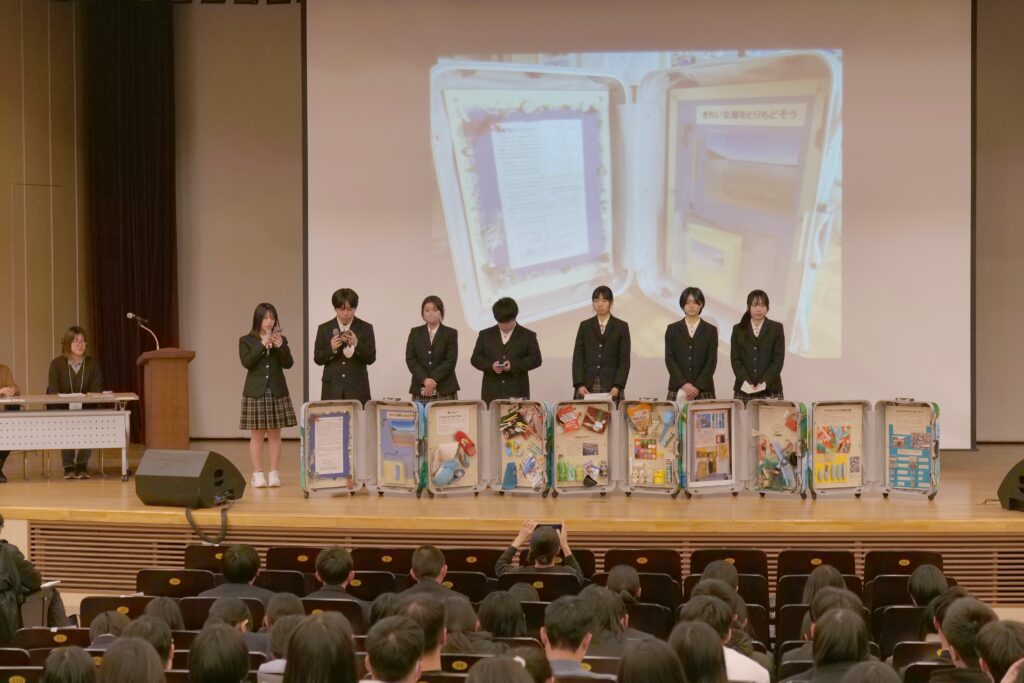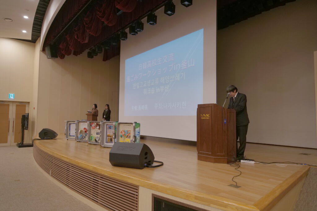 海岸清掃から始まり、博物館大講堂にてワークショップが行われ、釜山で海ごみ問題に取り組んでおられるモイダ協同組合代表のモ・サンミ様による基調講演や、対馬高校生によるトランク・ミュージアム®対馬版の説明が行われました。